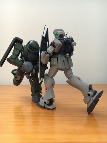 ザクとジムが地上で戦ったら、です。ガンプラを作ったら一回やってみたかったんです。子供っぽいですが。 ザクのマシンガンは装弾数は多いが初速が遅くて命中させるのが難しい。一方で、ジムのビームライフルは光速で届くけど、ザクの装甲を溶かし貫通するに…